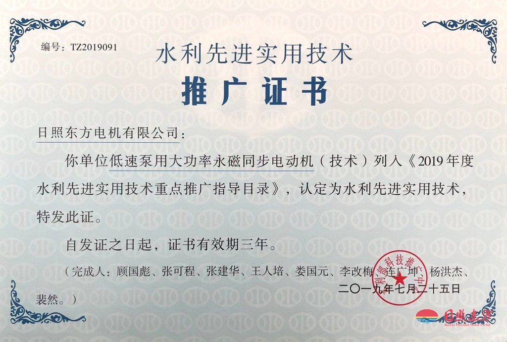 水利先進適用技術推廣證書-2019-低速泵用大功率永磁同步電動機