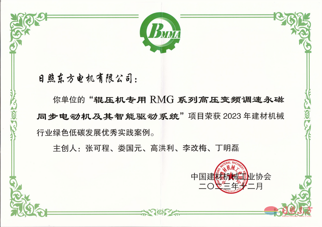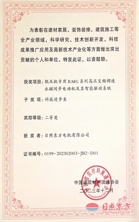 輥壓機專用RMG系列高壓變頻調速永磁同步電機獲得2023年中國建筑材料流通協(xié)會科學技術二等獎